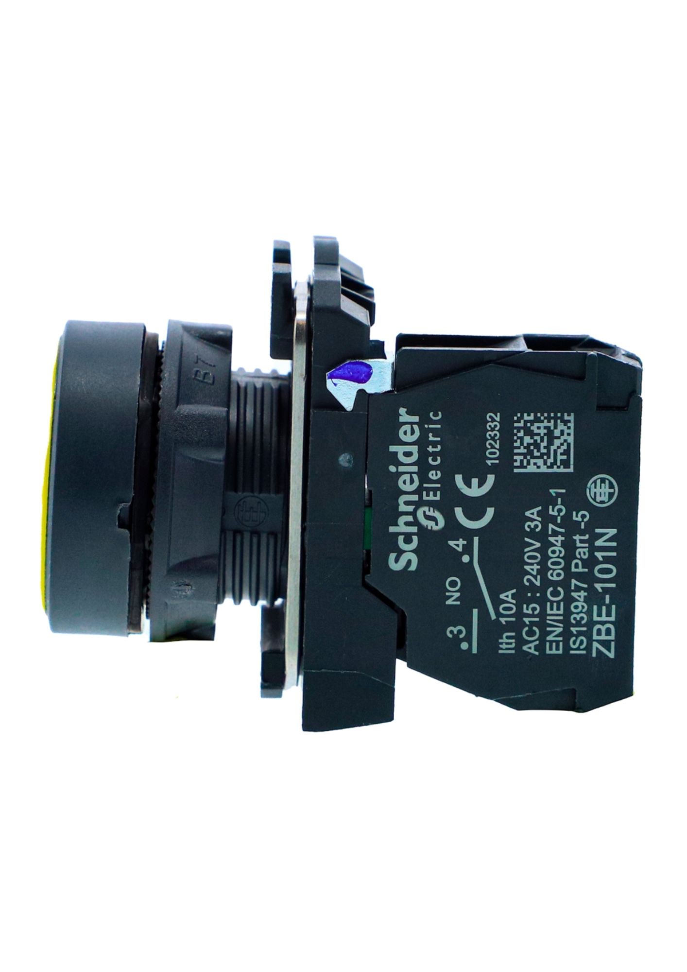 Schneider XB5AA51N, Push button, Harmony XB5, Plastic, Flush, Yellow, 22mm, Spring Return, Unmarked, 1 NO