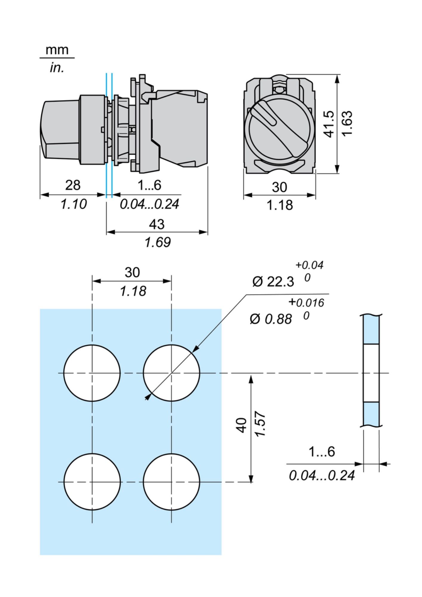 | Device mounting | Fixing hole Ø 22.5 mm (22.3 +0.4/0) IEC 60947-5-1 |