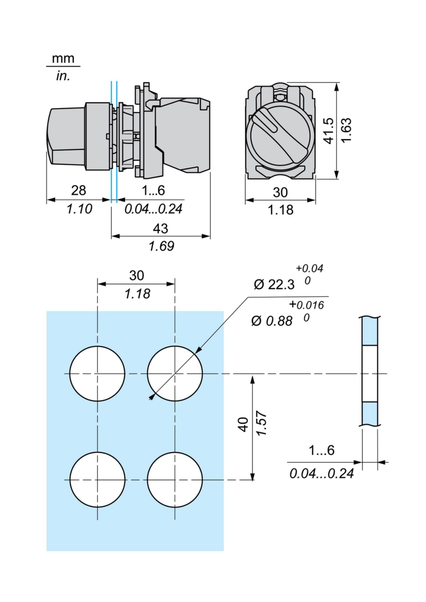 | Device mounting | Fixing hole - diameter: 22.5 mm 22.3 +0.4/0 (IEC 60947-5-1) |