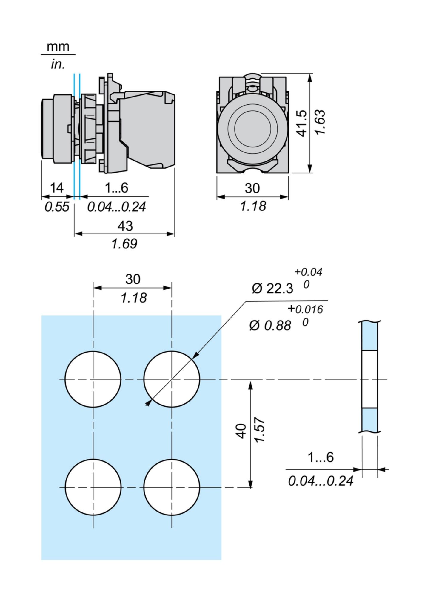 | Device mounting | Fixing hole – diameter: 22.5 mm 22.3 +0.4/0 (IEC 60957-5-1) |